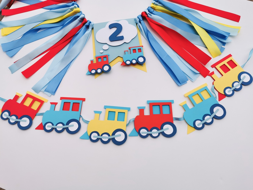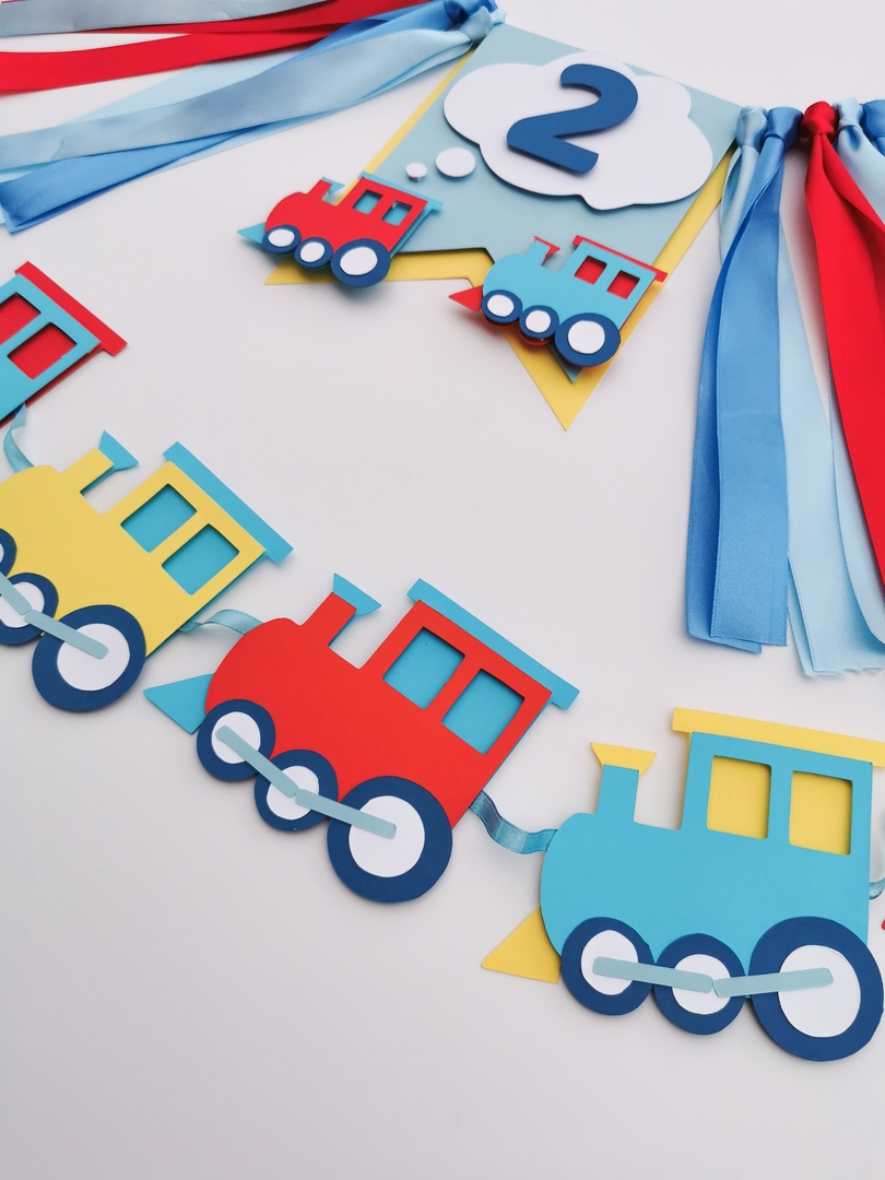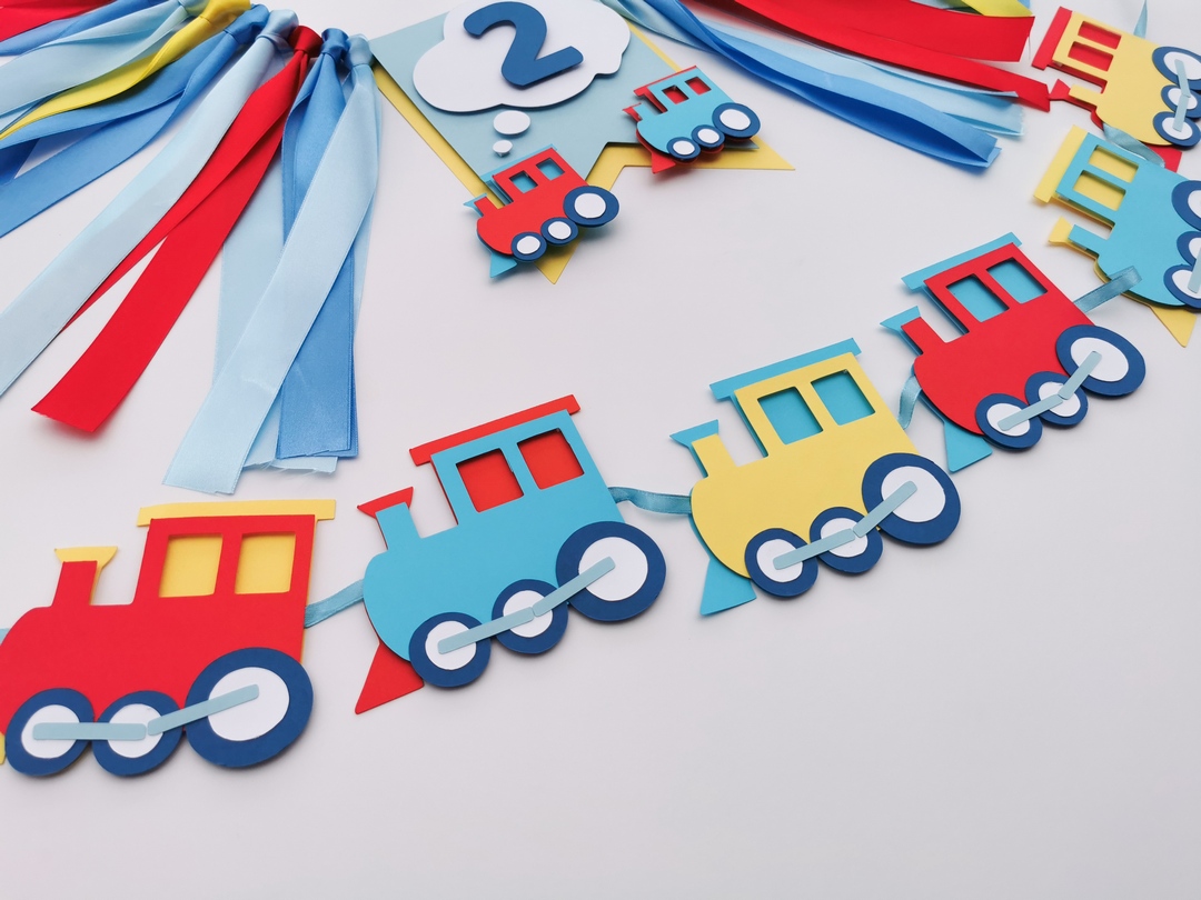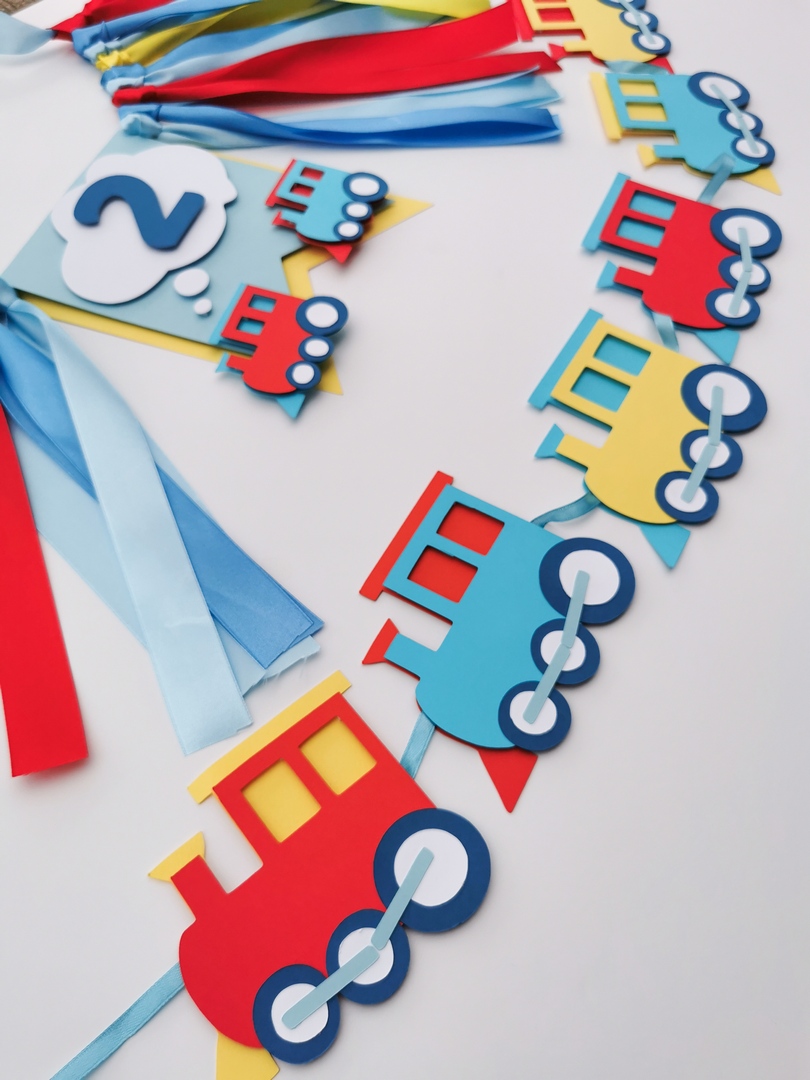 Ręcznie robiona, girlanda dekoracyjna pociągi. Doskonale sprawdzi się do dekoracji przyjęcia urodzinowego przedszkolaka czy na roczek. Możesz zawiesić ją na ścianie, w oknie czy ozdobić nią słodki stół. Po przyjęciu udekorujesz nią też dziecięcy pokój.