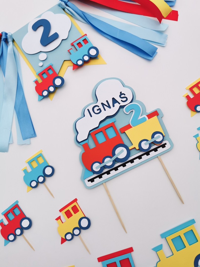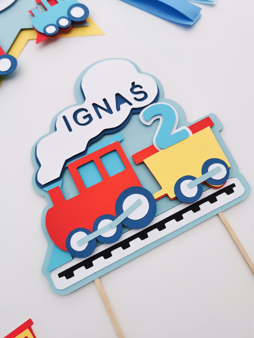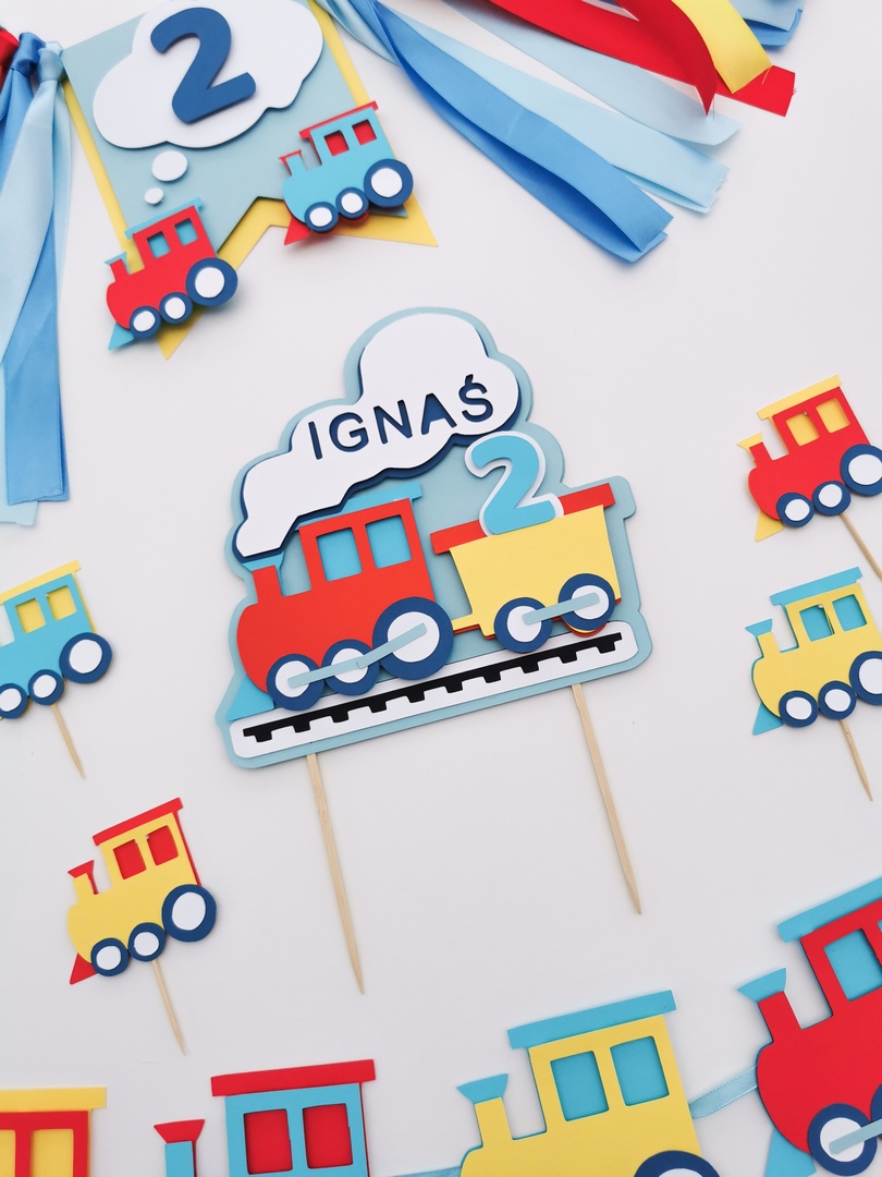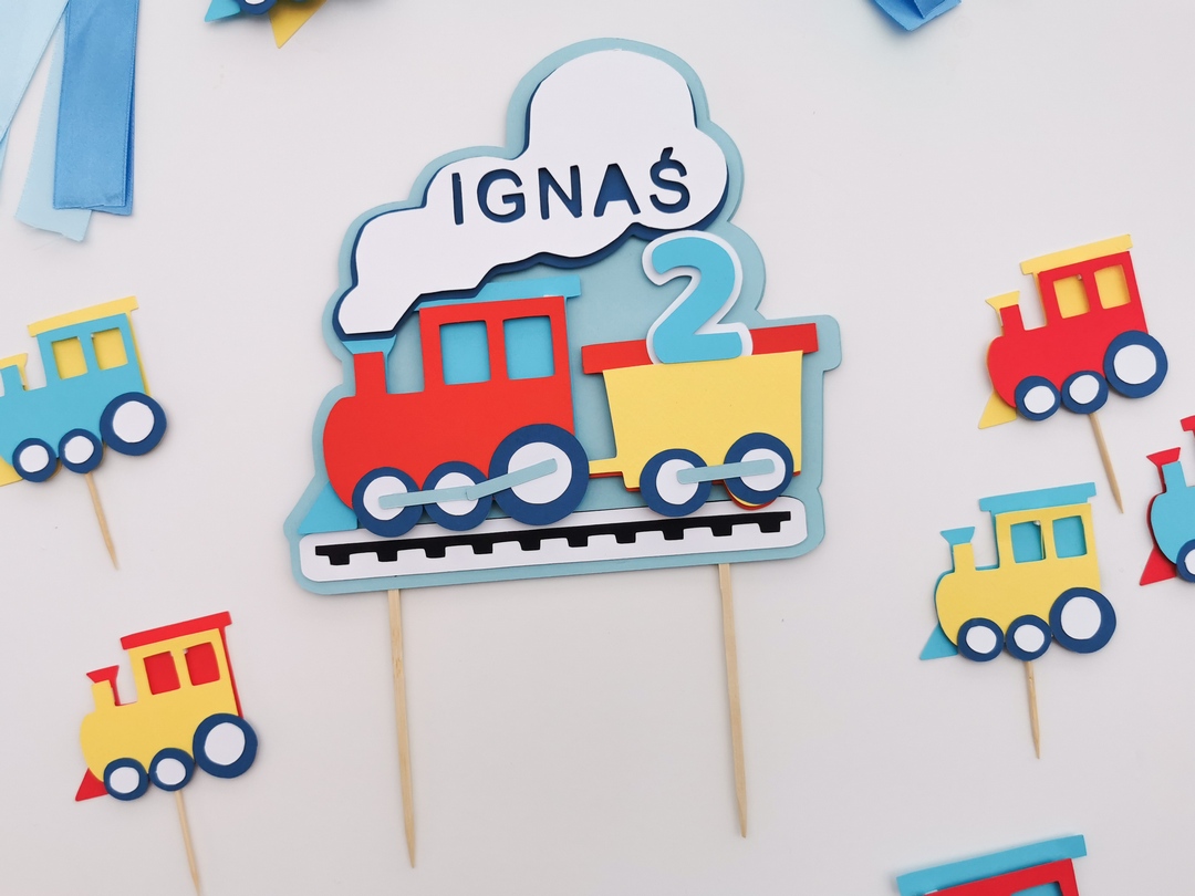 Ręcznie robiony personalizowany topper z motywem pociągów. To obowiązkowy element każdych dziecięcych urodzin.  Podaj imię i wiek małej Jubilatki/ małego Jubilata, a otrzymasz wyjątkową dekorację, która będzie pięknie prezentować się nawet na zwykłym cieście.